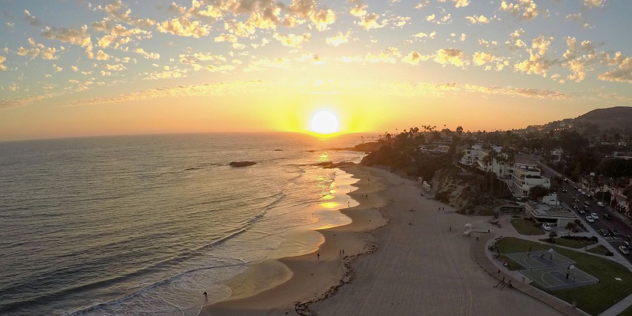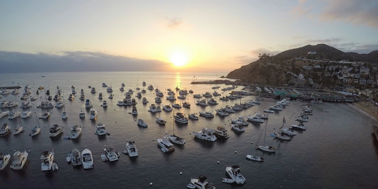 High above the boats resting in the morning at sunrise over Avalon Bay.